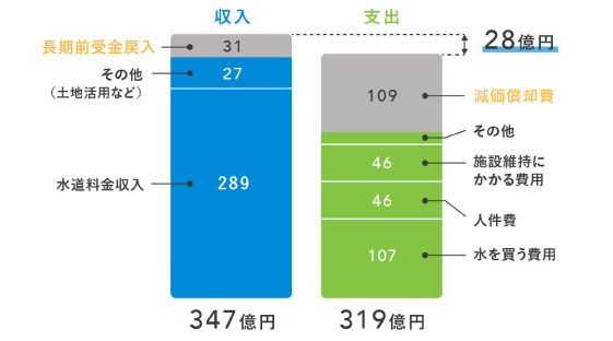 収入347億円に対し、支出319億円となっており、28億円の利益です。(利益の28億円は、将来の水道施設を更新するためのお金として積み立てます)。
