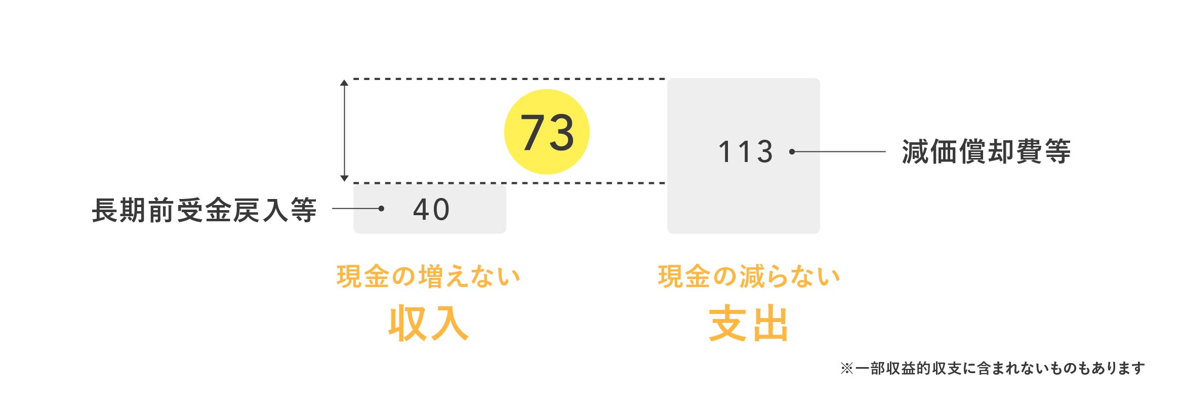 (現金の減らない支出(減価償却費など)と現金の増えない収入(長期前受金戻入など)の差額) 73億円