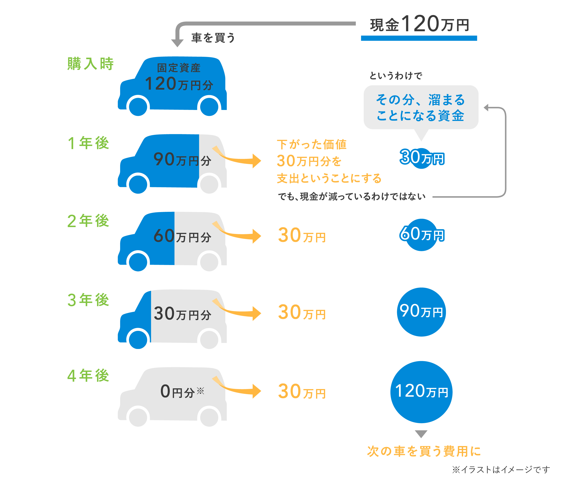 減価償却費は会計上の支出としているだけで実際に現金が出ていくわけではないため、その分、現金が溜まります。4年で120万円溜まる現金は、次の買い替えの資金になります。