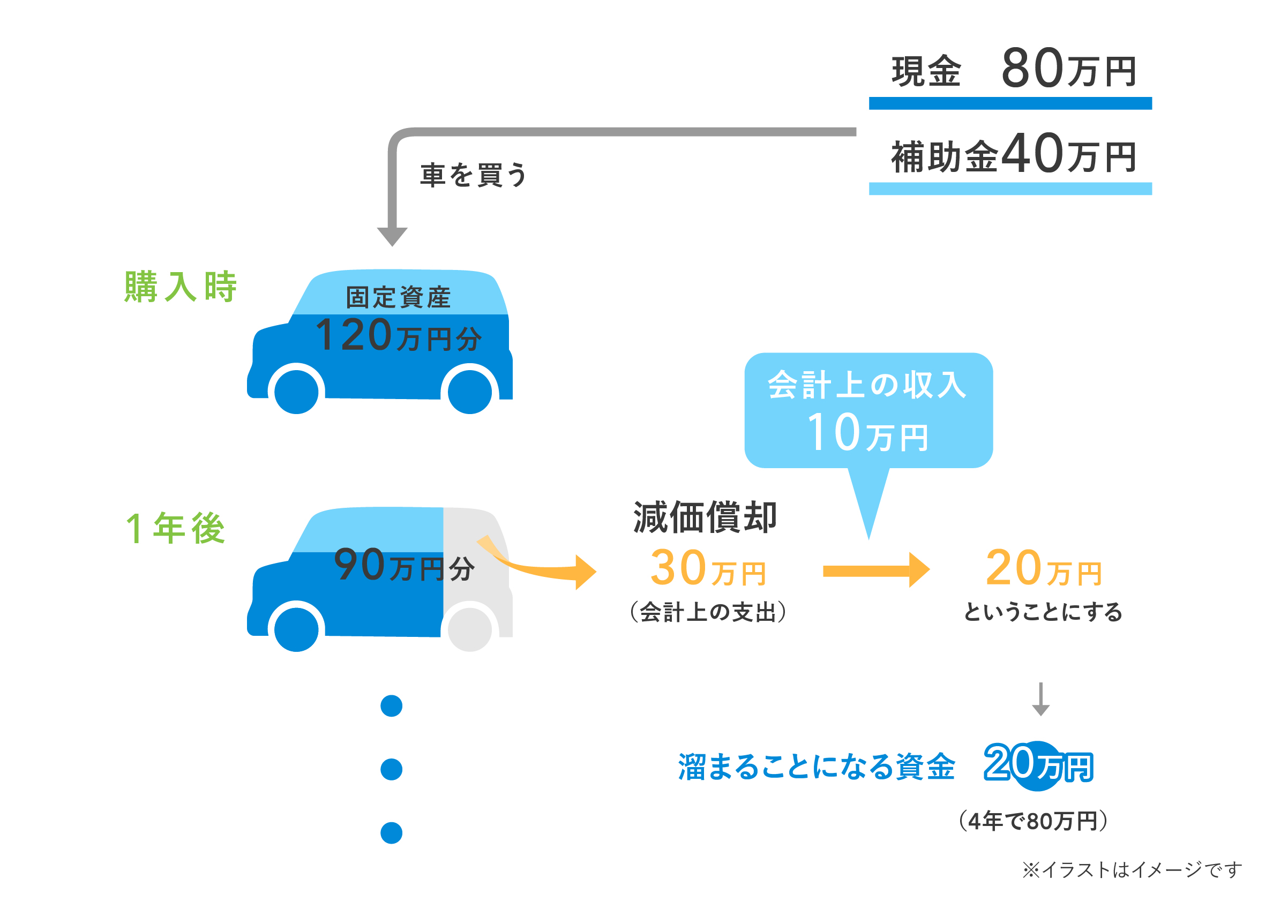 そこで、次の買い替え時にも国の補助金40万円があるため、次の買い替え時の資金は80万円(車120万円-補助金40万円)あればいいと仮定します。それであれば、減価償却する際は過去に貰った補助金分10万円(40万円÷4年)は、資金として留めなくてもよいことになります。